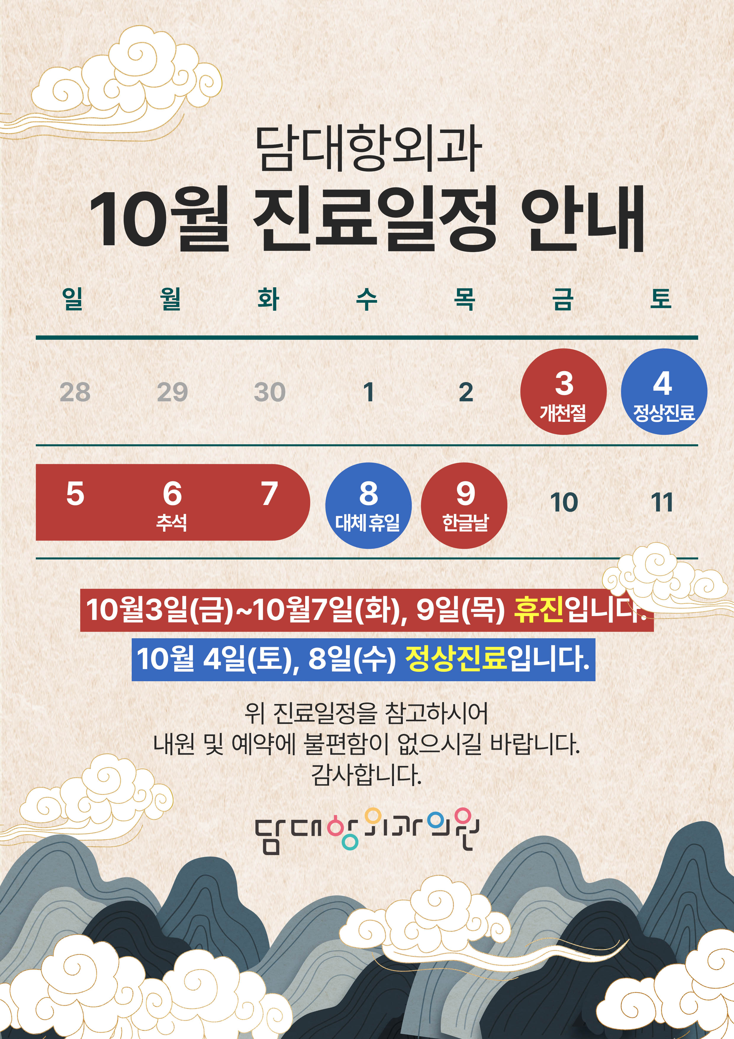 안녕하세요 담대항외과 10월 진료일정 안내드립니다.