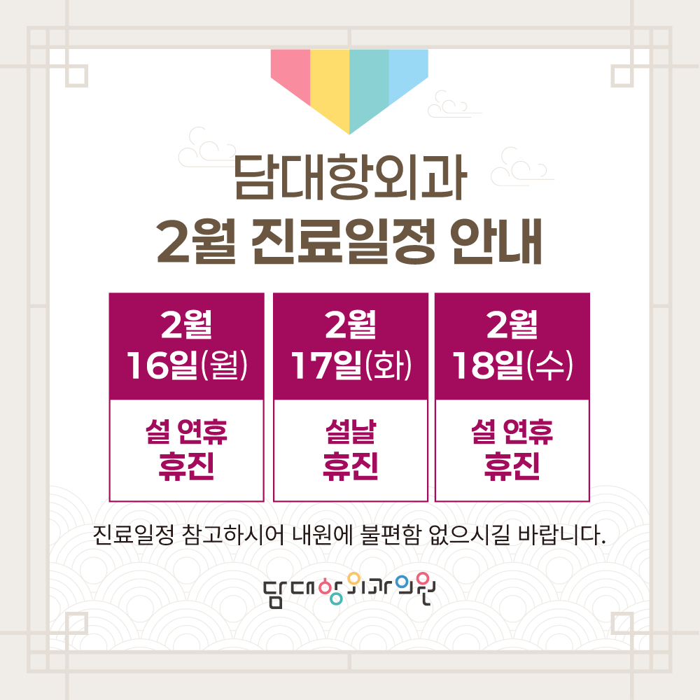 담대항외과의 설 연휴 일정을 안내해 드리겠습니다.